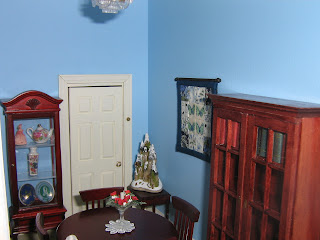 Just recently I decided my dining room needed a quilt on the wall. I made one for my full size dining room a few years ago. It was packed away when my husband decided to knock down that wall....and haven't found a place to put it since. When I went to find it so that I could copy it for my mini dining room, I couldn't find it...it took me three weeks of searching until I finally found it!! It was packed away with my bed quilt that I can't put on my bed because of the sun. It took me 10 years to piece, patch and quilt so is too precious to use LOL! I had finished my mini quilt before I found it so they are not quite the same.